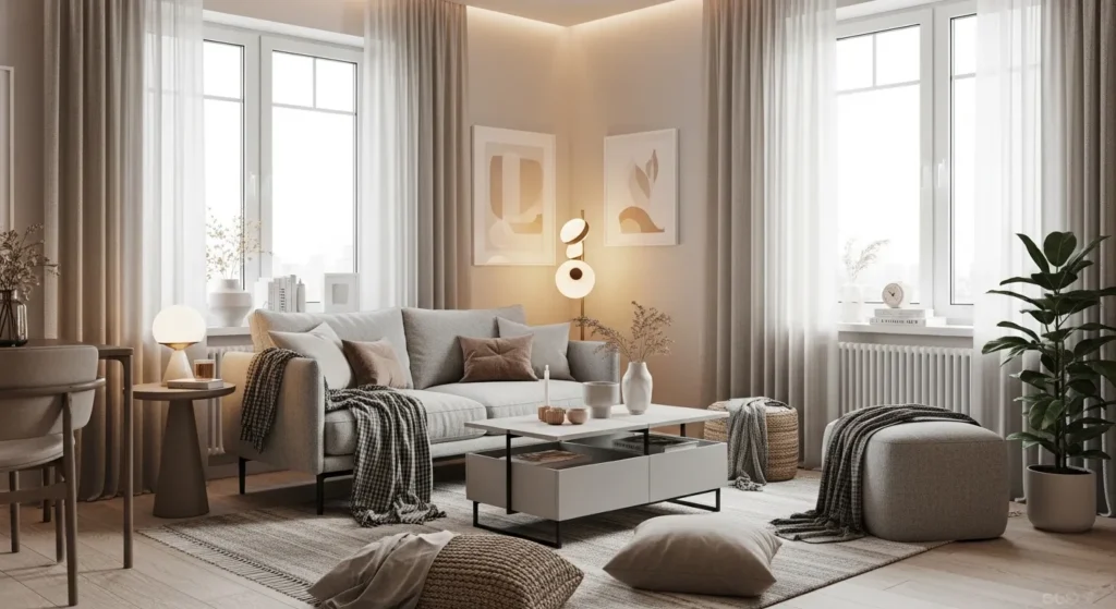 For a truly inviting apartment living room in 2026, neutral tones combined with warm textiles are a go-to design. Think soft beige or light gray walls paired with plush wool or cotton throws, soft linen cushions, and wooden furniture. The gentle neutral base allows the warmth of textiles to shine, making the room feel calm and cozy. The overall effect is a serene, welcoming space that’s perfect for relaxing after a long day.
