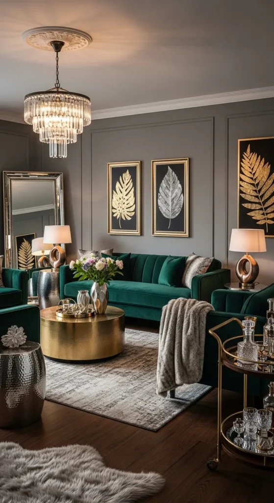To ensure the room doesn’t feel too opulent, balance the luxe velvet and metallic elements with neutral tones on the walls and floors. Adding soft lighting, such as dimmable chandeliers or table lamps with metallic bases, will enhance the overall glamour while maintaining a warm, inviting ambiance perfect for hosting or relaxing.