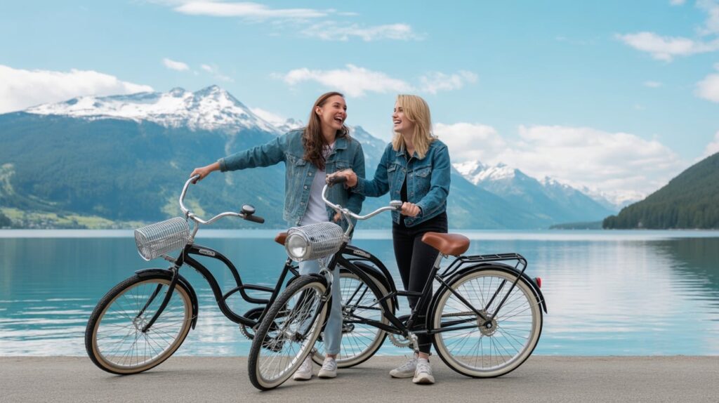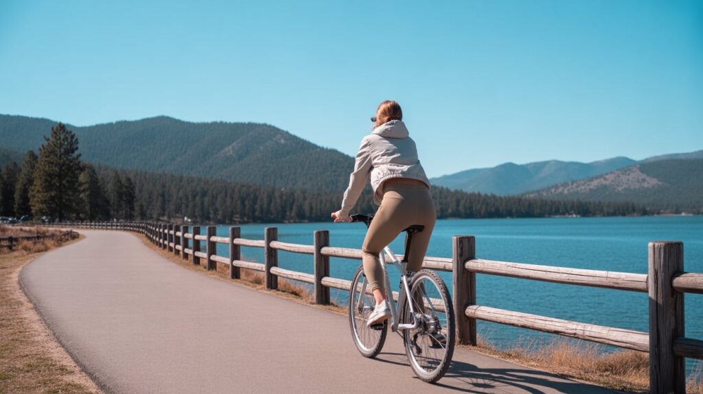 A casual bike cruise is a fun way to connect multiple stops without feeling like you’re constantly driving. You can ride short segments near the Village, then shift toward a lakeside path area for views. This creates variety—town textures, then nature textures—while staying low effort. It also gives you photo-friendly moments like bikes leaning on a fence, helmets in hand, and candid riding shots.