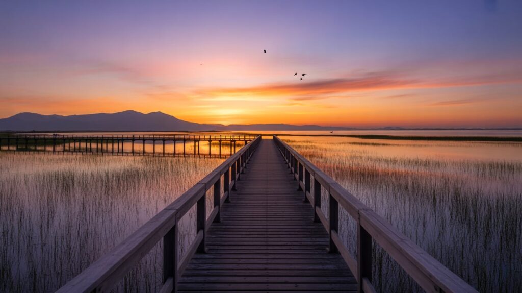 Arrive before golden hour so you can walk slowly and choose your best photo angles. If the main lot is busy, be patient and keep the stop light and unhurried. Take a mix of shots: wide landscape pins, close-up detail photos of the boardwalk texture, and simple silhouettes against the sky. On your map, place Stanfield Marsh near the end of Day 2 as a “soft landing” before dinner.
