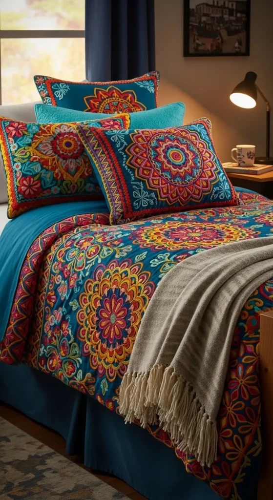 Embroidered bed linens offer a fantastic way to bring texture and detail into your Boho dorm room. The intricate designs and vibrant threads create a rich, artistic look, turning your bed into a focal point in the room. Choose linens with ethnic patterns or soft floral motifs to match the Boho theme and make your bed a cozy, stylish retreat.