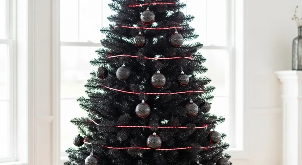 Inspired by the “Cyberpunk” aesthetics of the mid-2020s, this theme uses a black tree as a canvas for vibrant, neon-colored decorations. Think electric pink, radioactive green, and cyan blue ornaments that look like they belong in a digital landscape. This theme is bold, energetic, and unapologetically modern, appealing to a younger, tech-savvy generation. The contrast between the dark branches and the glowing colors creates a striking visual punch that works exceptionally well in contemporary, urban spaces and lofts with large windows.