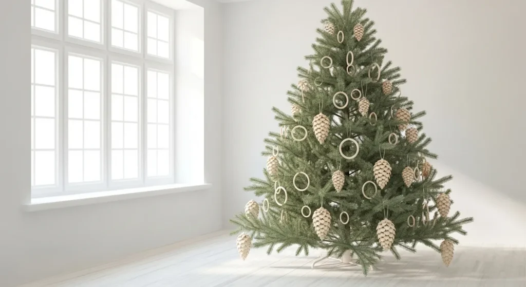 To keep this look modern, focus on clean lines and repetitive patterns. Use wooden rings or laser-cut wooden stars that are uniform in color to maintain a cohesive aesthetic. You can add a bit of texture by incorporating hand-carved wooden beads as a garland, draped loosely over the branches. Avoid using any bright colors; stick to a palette of beige, tan, and soft whites. This tree looks best in a sun-drenched corner, where the natural daylight can highlight the warmth of the wood, creating an inviting and cozy atmosphere.