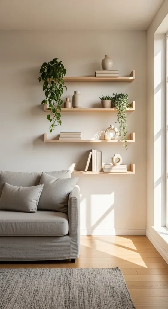 Add floating shelves to showcase books, plants, and decorative accents. This design element combines practicality and modern aesthetics while maintaining a cozy vibe.