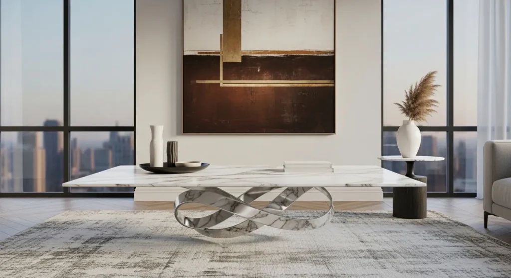 For a truly luxurious and artistic touch, a floating marble coffee table with a sculptural base serves as both a functional piece and an art installation. The marble top is supported by a unique, sculptural base, which creates an eye-catching focal point. This design adds a sense of drama to any room, while the marble surface maintains its timeless elegance.