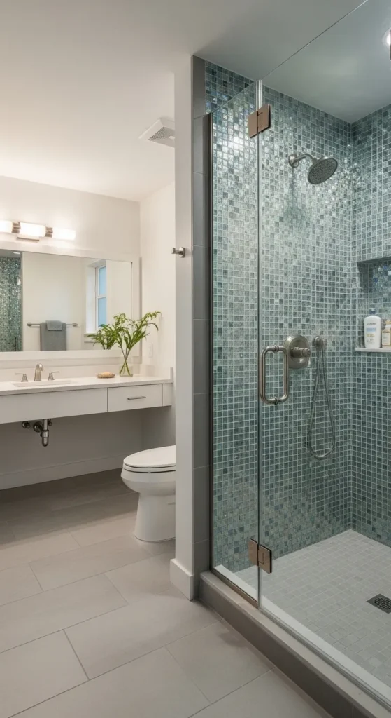 To complement the glass tiles, consider pairing them with minimalist fixtures and sleek, frameless glass doors to maintain an open, airy feel. The reflective surface of the tiles brightens the room and adds a sophisticated touch to the shower area, creating a high-end, spa-like experience.